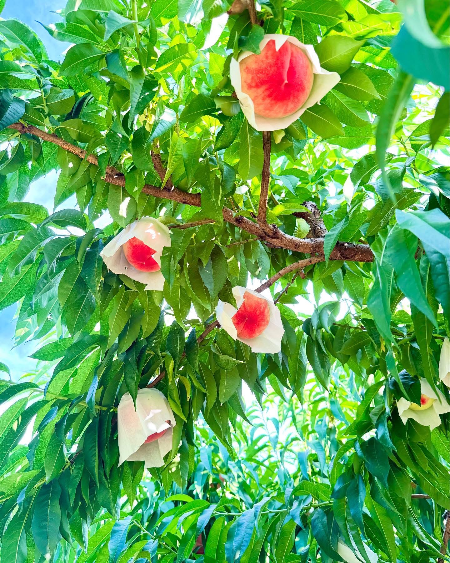 夏の訪れとともにだんだんと色づいてくる桃。そのひとつひとつを丁寧に、大切に育てて